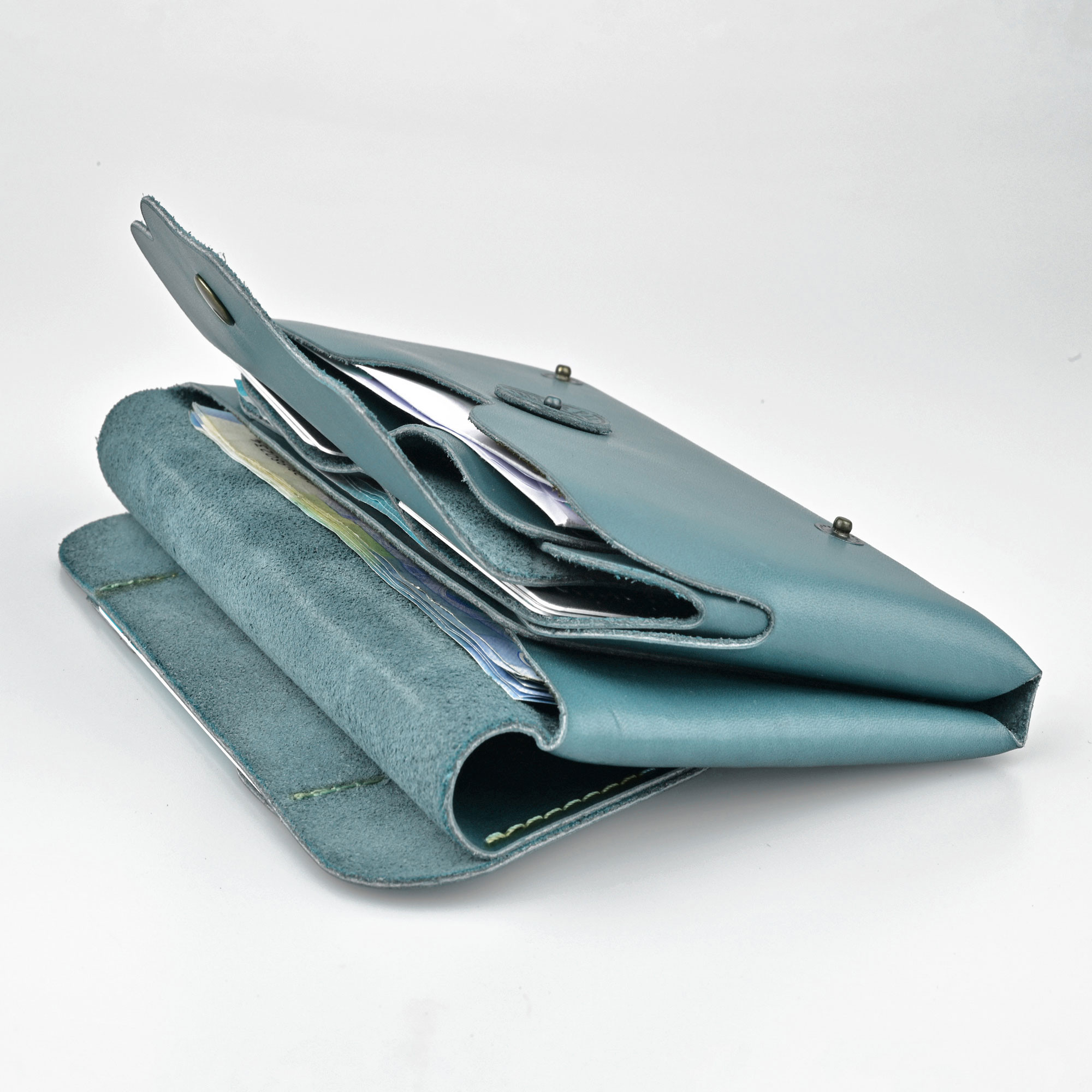 Women long wallet designed and handcrafted using supple vegetable tanned leather with round edges for a compact and comfortable grip. The compact size has been achieved with a special technique that minimizes dead space caused by edge seams. Multiple cards, bills and coin pockets built into a small wallet.
